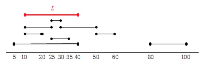 그림 1 에 있는 예를 고려해보자. 여기서 n = 8, (h1, o1) = (5, 40), (h2, o2) = (35, 25), (h3, o3) = (10, 20), (h4, o4) = (10, 25), (h5, o5) = (30, 50), (h6, o6) = (50, 60), (h7, o7) = (30, 25), (h8, o8) = (80, 100)이고, d = 30이다. 이 예에서, 위치 10 과 40 사이의 빨간색 선분 L이, 가장 많은 사람들에 대하여 집과 사무실 위치 모두 포함되는 선분 중 하나이다. 따라서 답은 4 이다.