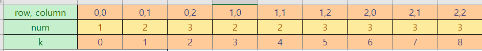 먼저, 2차원 배열의 행과 열, 원소값, 1차원 배열의 인덱스간에 규칙성을 찾기 위해 이 값들을 좌르륵 나열해봤다.
